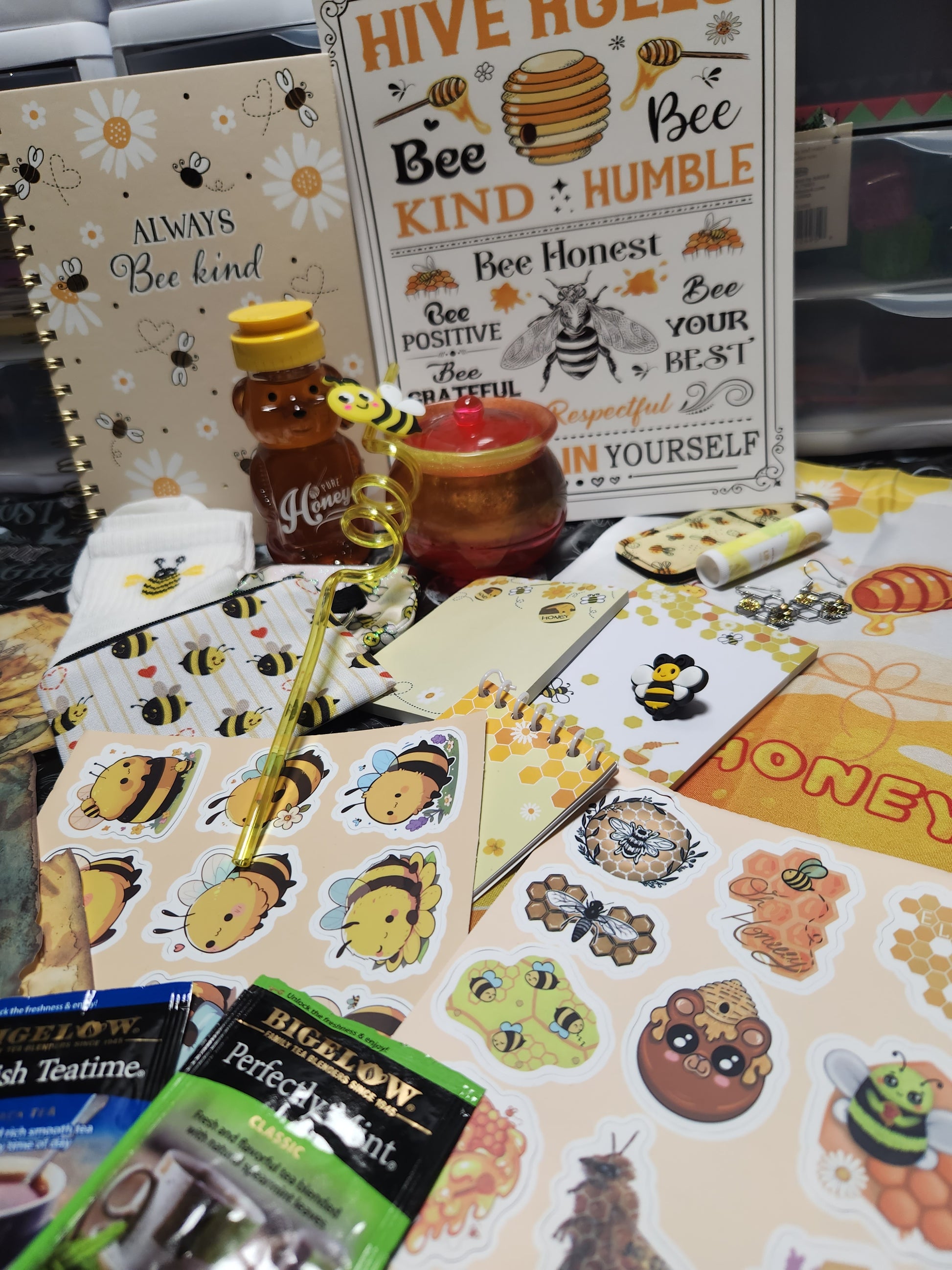 This Bee-utiful Bundle is unBEElievably cute! Each bundle has a custom resin honey pot in your choice of colors, journal, sign, nylon backpack, socks, craft paper, pin, Earrings, Stickers, pens, keychain, coin purse, tea samples, straw, stickie notes, small pocket notebook, Lip Balm holder with lip balm and small bag.